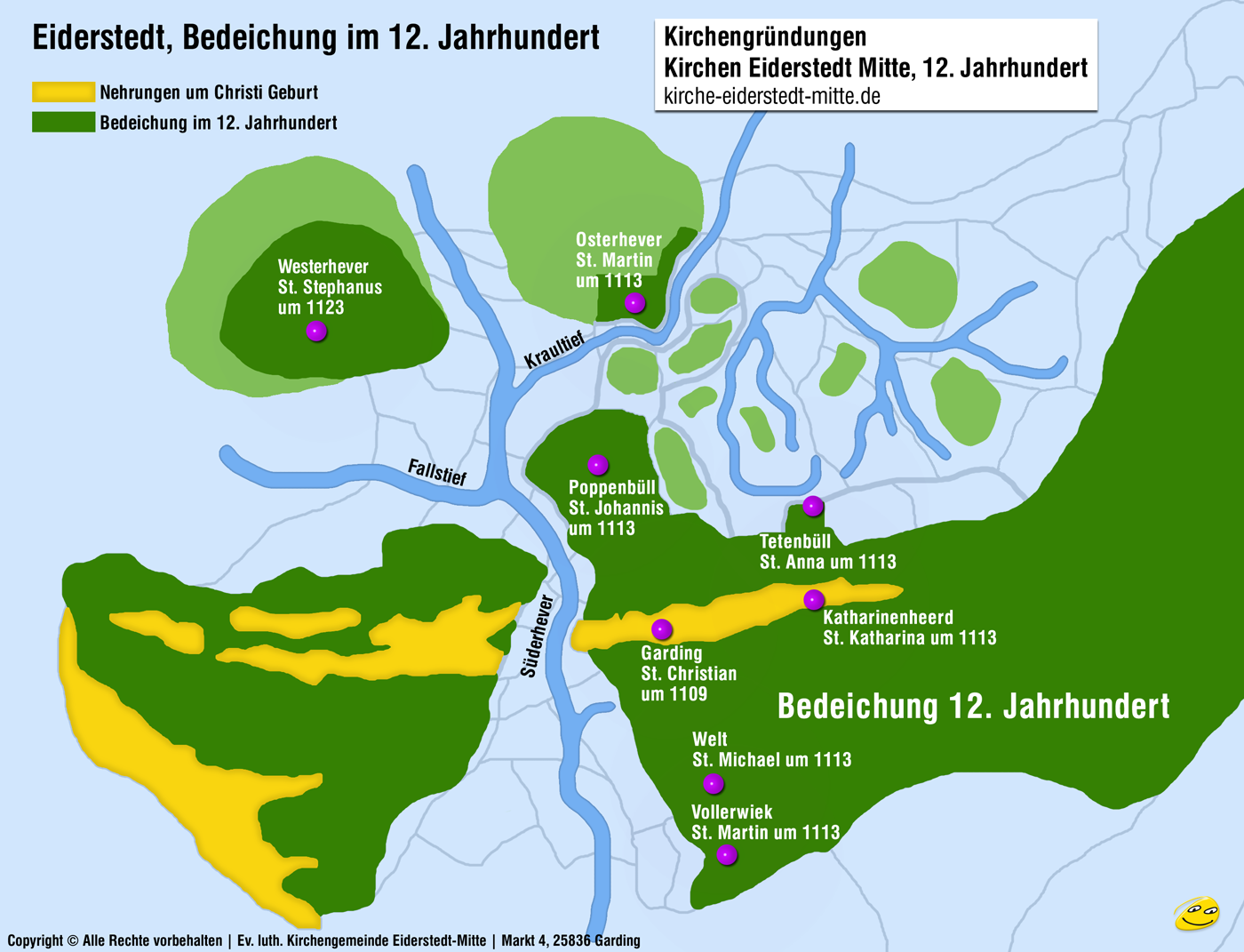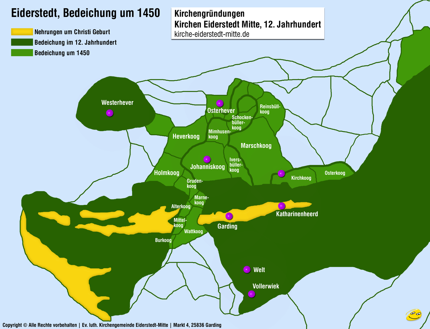 Auf unseren einzelnen Kirchenseiten versuchen wir, die Entstehung der Kirchengemeinden Eiderstedt-Mitte zu erläutern. Um ein besseres Verständnis für diese Zeit zu vermitteln, haben wir hier Grafiken vorbereitet, die unsere Eiderstedter Bedeichungsgeschichte dokumentieren.