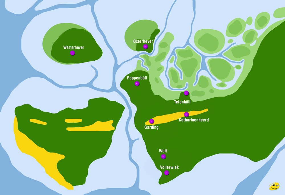Schon sehr früh wagten sich mutige Siedler auf die Sandverdriftungen der Nordsee (Nehrungen). Im Umland der Nehrungen wurden durch Ebbe und Flut ununterbrochen Sedimente angeschwemmt und abgelagert. Die Wattenlandschaft wuchs an und die aufgewachsenen Seemarschen wurden Siedlungsgebiete. Von Menschenhand aufgeschüttete Hügel (Warften) gaben Schutz vor Flut und Sturmfluten.