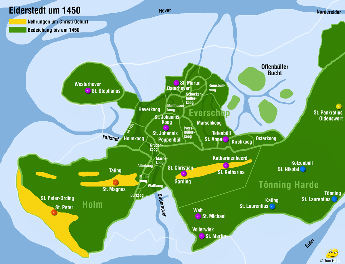 Von den freilich nur teilweise überlieferten Gründungsdaten der Kirchen folgen sich: … 1109 Garding; nach 1113: Welt, Vollerwieck, Tetenbüll, Poppenbüll, Osterhever, Katharinenheerd ...