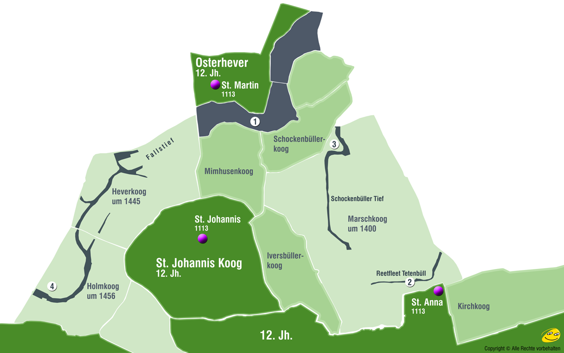 Die Landschaft des 12 Jh. ist deshalb so schwer zu rekonstruieren, weil 1362 die Jahrhundertsturmflut „Grote Mandrenke“ (Zweite Marcellusflut) weite Teile des Gebietes zerstörte. Über die Zeit davor lassen sich meist nur Vermutungen anstellen - ohne endgültige Gewissheit.